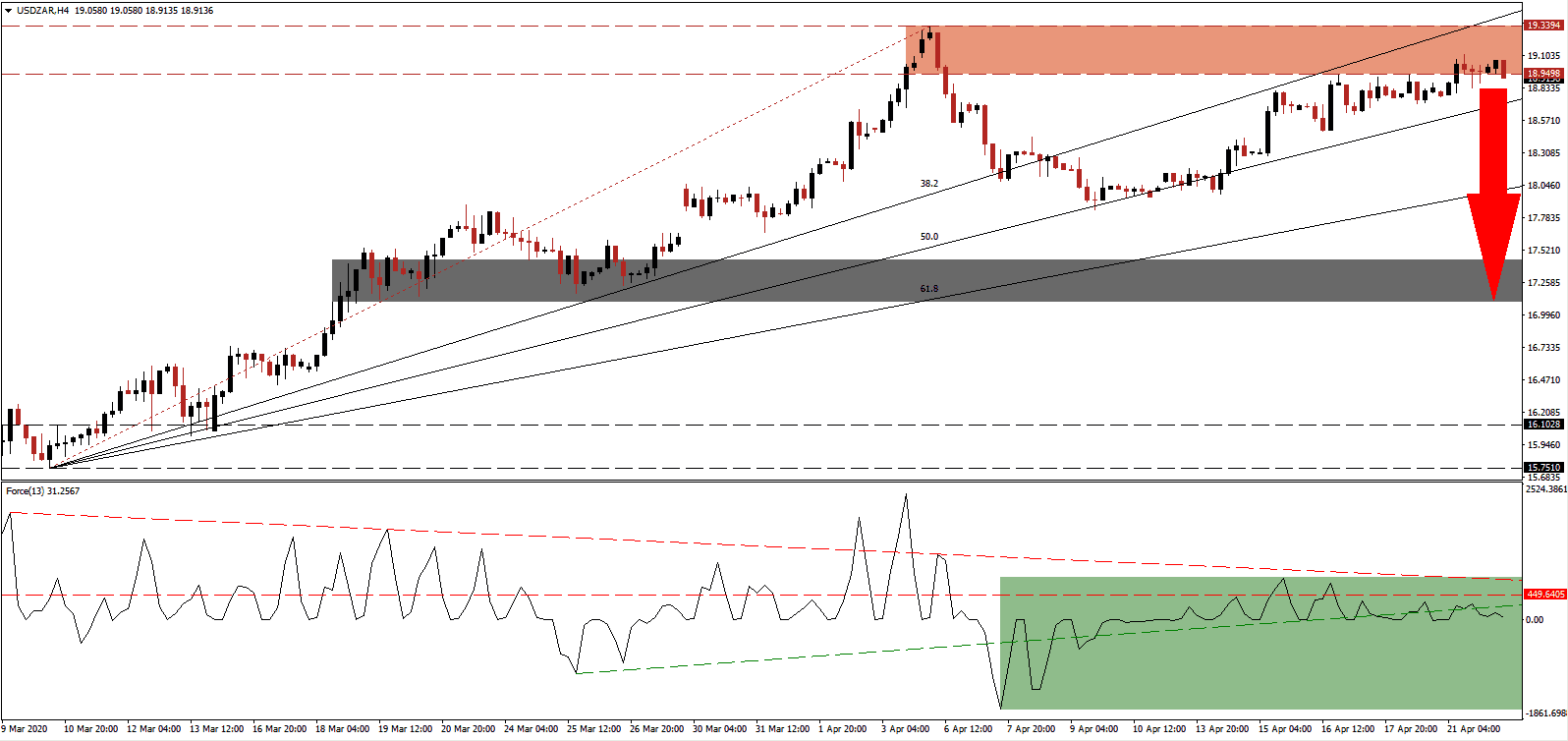 Should the Force Index accelerate above its descending resistance level, the USD/ZAR is likely to attempt a push to the upside. Forex traders are recommended to consider any breakout as a temporary event and an outstanding selling opportunity. Tomorrow’s US initial jobless claims data could provide the next bearish fundamental catalyst. The next resistance zone is located between 20.4061 and 20.6123.