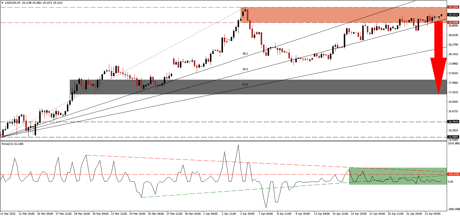 A breakout in the Force Index above its descending resistance level could temporarily extend the advance in the USD/ZAR. Mounting US job losses, the collapse in regional economic activity, and misappropriation of stimulus capital, significantly impact the upside potential. The next resistance zone is located between 20.4061 and 20.6123, and Forex traders are recommended to consider this a secondary entry-level to existing short positions.