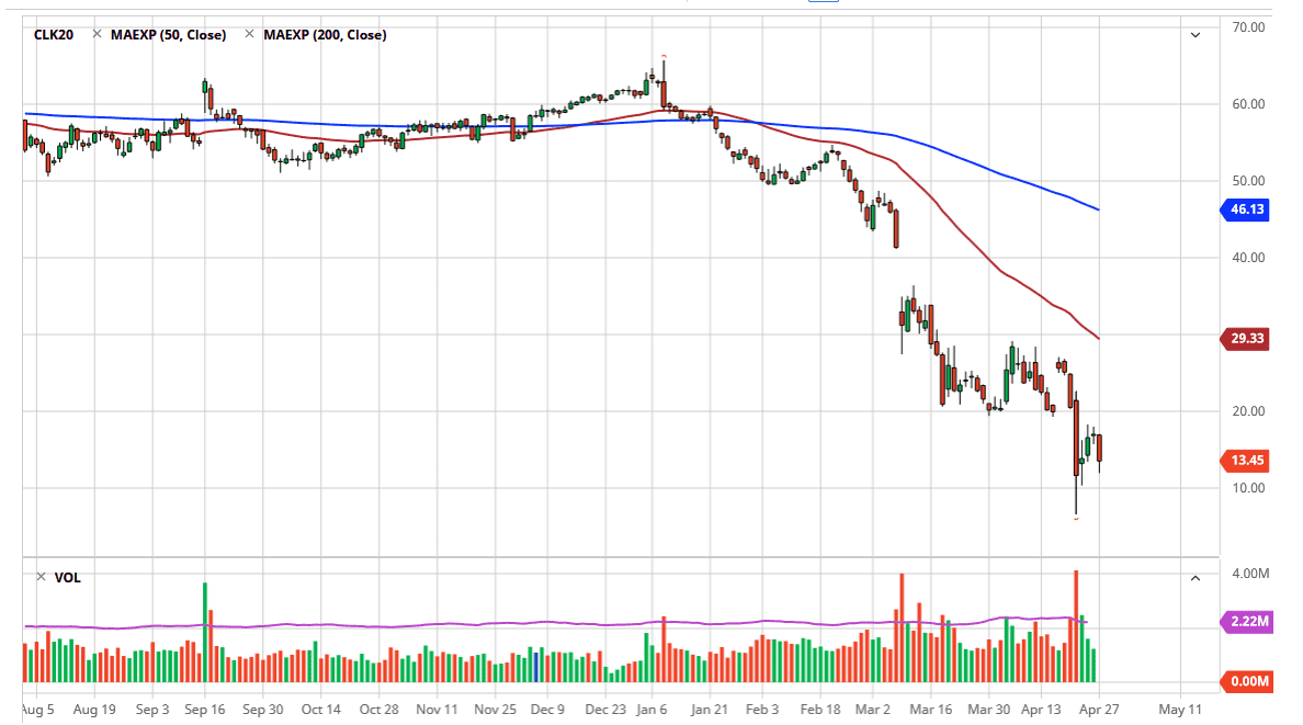 To the upside, I believe the $20 level will act as a short-term ceiling, while the $10 level underneath looks to be rather supportive. Do not get me wrong, I think we will find it more than enough pressure to break down below the $10 level. Furthermore, there is no demand for crude oil which is going to make this even worse. We have gotten far beyond the ability of OPEC to cut enough barrels to bring the price back up, because quite frankly until economies get moving, there is no need for crude oil. Barring some type of miracle, this is a market that will not be able to rally for exceptionally long. You can even see that during the previous week we had three green days in a row, but they were not exactly explosive. Because of this, crude oil will continue to see negative momentum from everything the chart is telling me.