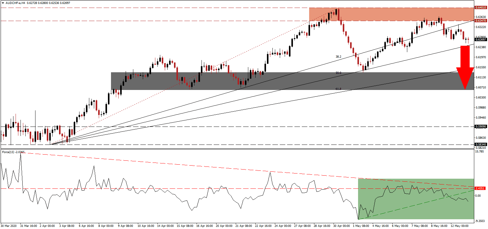 Switzerland is implementing strict contact tracing measures alongside the return to modified economic activities. The economy is bleeding up to an estimated CHF17 billion per month, adding pressure to find an alternative path forward. A change in consumer behavior should be expected, extending the recovery period for the economy. Following the breakdown in the AUD/CHF below its resistance zone located between 0.6347 and 0.6401, as marked by the red rectangle, bearish pressures have accumulated.
