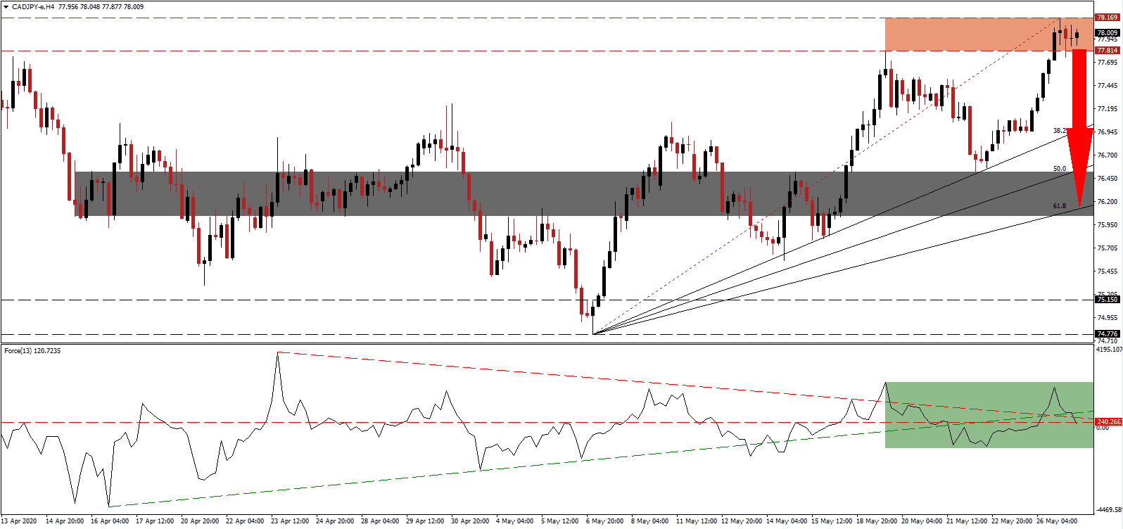 Should the Force Index accelerate above its ascending support level, serving as resistance, the CAD/JPY may attempt to push higher. Forex traders are advised to take advantage of any breakout attempt with new net short positions. The threat of a new infection wave over the summer, as governments lift lockdowns, remains dominant and favors a strengthening in Japanese Yen. The next resistance zone awaits price action between 79.406 and 79.845.