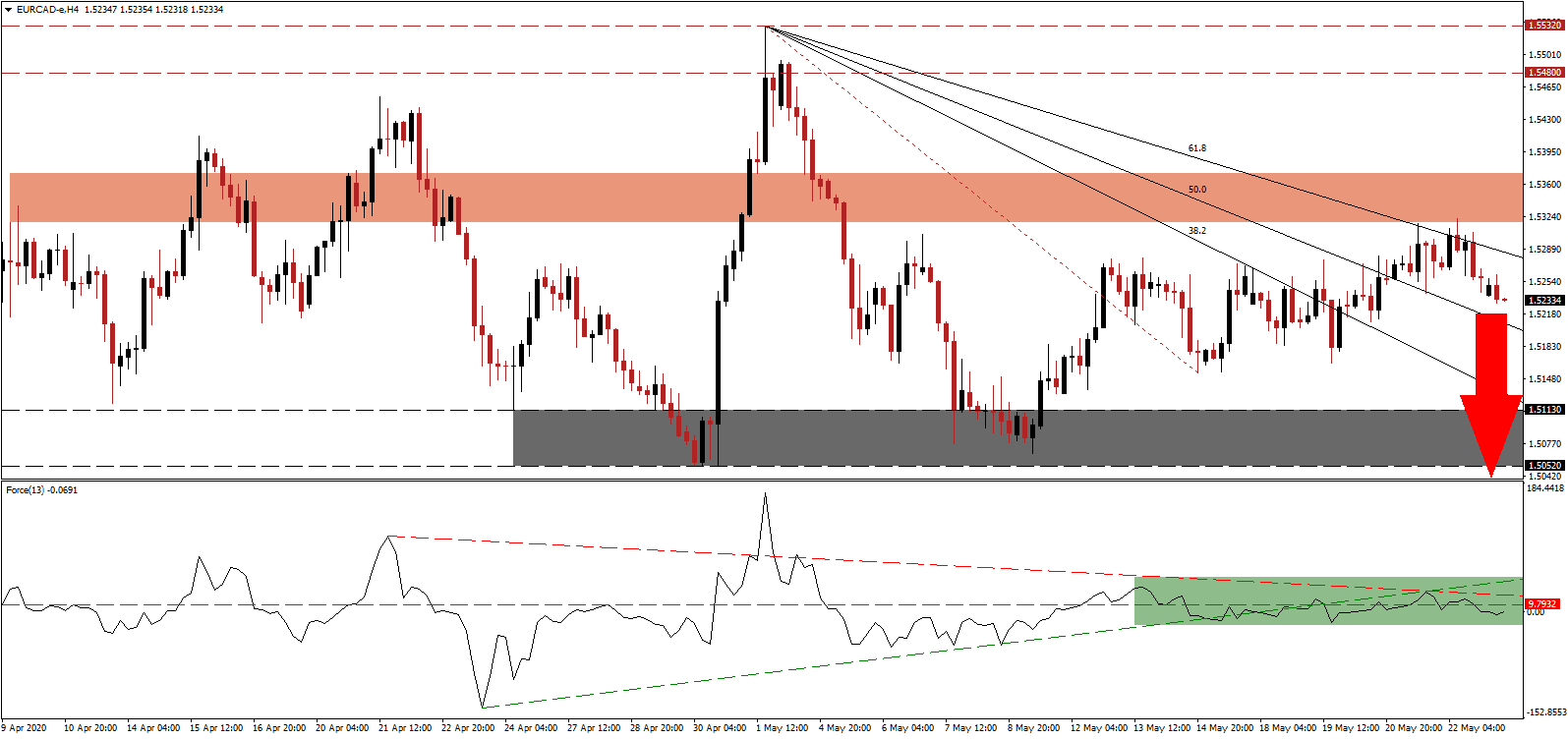 After the release of preliminary PMI data for May, it appears the Eurozone economy has bottomed out. The road to recovery remains long and painful, while a secondary contraction in data cannot be excluded. While global PMI data is showing an improvement, the comparison is against depressed data with the overall reading well-below the 50.0 level. The European Central Bank does not believe a return to pre-Covid-19 levels before 2021 at the earliest, and economic forecasts fail to account for a permanent change in consumer behavior. After the EUR/CAD was rejected by its short-term resistance zone, the descending 61.8 Fibonacci Retracement Fan Resistance Level is increasing downside pressure.