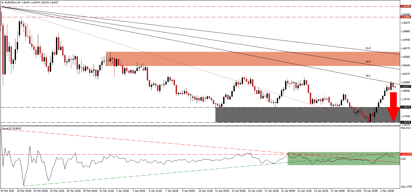 Should the Force Index push above its ascending support level, the EUR/NZD is likely to attempt a breakout. Due to fundamental developments, the upside potential remains limited to the top range of its short-term resistance zone, with the 61.8 Fibonacci Retracement Fan Resistance Level favored enforcing the bearish chart pattern. Forex traders are recommended to take advantage of any price spike with new sell orders.