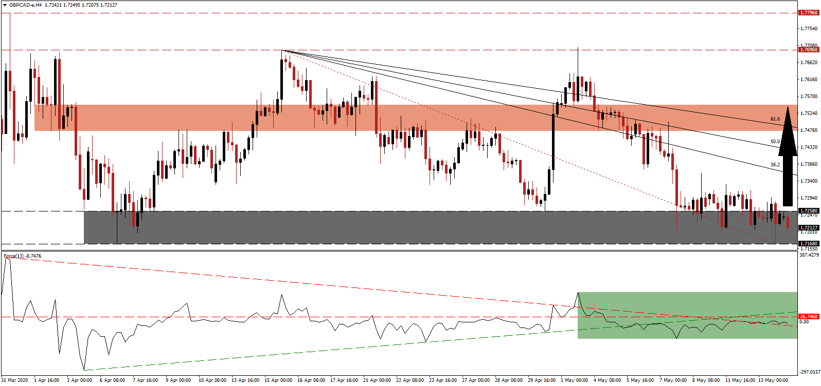 De acuerdo con la Junta de la Conferencia de Canadá, Calgary y Edmonton serán los más afectados por la recesión, y cada ciudad importante se enfrentará a un entorno recesivo. El Reino Unido recibirá un importante catalizador fundamental a bullish de largo plazo después de que finalice el período de transición del Brexit este año, lo que le permitirá al país alcanzar acuerdos comerciales y recuperar el control total de su economía y sus fronteras. Un breakout por encima del nivel descendente de resistencia del abanico de retroceso de Fibonacci 38.2 despejará el camino para que el GBP/CAD acelere en su zona de resistencia a corto plazo ubicada entre 1.7475 y 1.7546, según lo identificado por el rectángulo rojo.