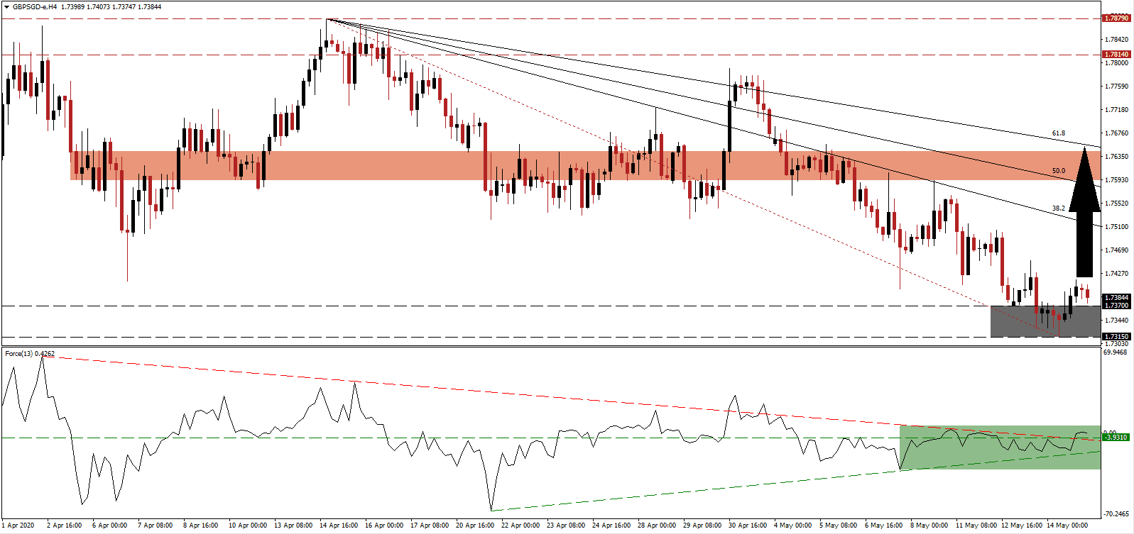 Governments around the world started to reopen their economies gradually but witnessed a spike in new infections. Singapore will ease certain restrictions on June 1st and then reassess the situation before opening up more sectors. The UK is on an equally patient roadmap, positioning both economies for sustained recovery. Ensuring a well-functioning test, trace, and isolate (TTI) infrastructure is paramount to combat the pandemic. The GBP/SGD is on track to move farther to the upside after its breakout above the support zone located between 1.7315 and 1.7370, as marked by the grey rectangle.