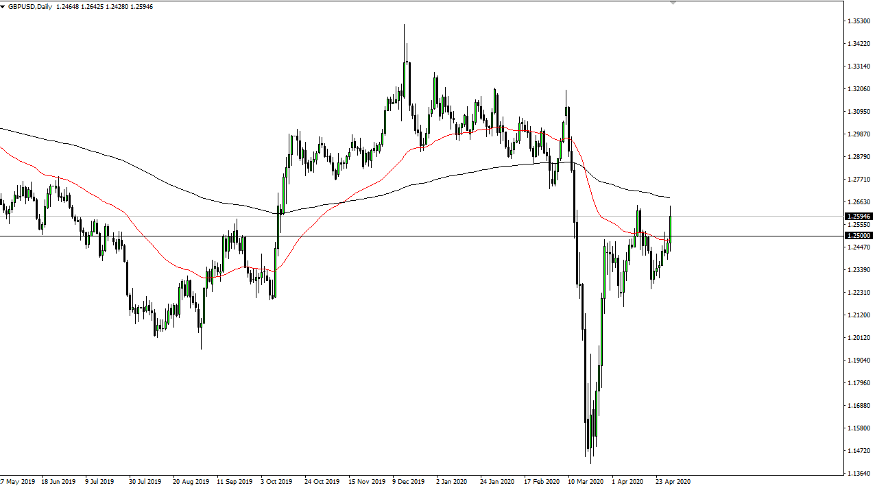 The British pound has rallied rather significantly during the trading session on Thursday, reaching towards the 1.26 level. We did pull back a little bit towards the end of the day, but at this point it looks as if the Federal Reserve is willing to do whatever they can to bring down the value of the US dollar. If they can do that, that should send the British pound higher, but at the moment we are looking at the 200 day EMA just above, so do not be surprised at all if the market pulls back.