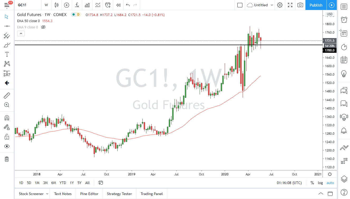 Gold markets have been sideways during most of the month of May, using the $1700 level as support. Furthermore, gold markets have also found the $1750 level as resistance, extending all the way to the $1760 level. In other words, we have been consolidating in after a massive breakdown, then recovery. You will notice that the market recovered at the 50 week EMA, and then shot straight up in the air during the month of March.