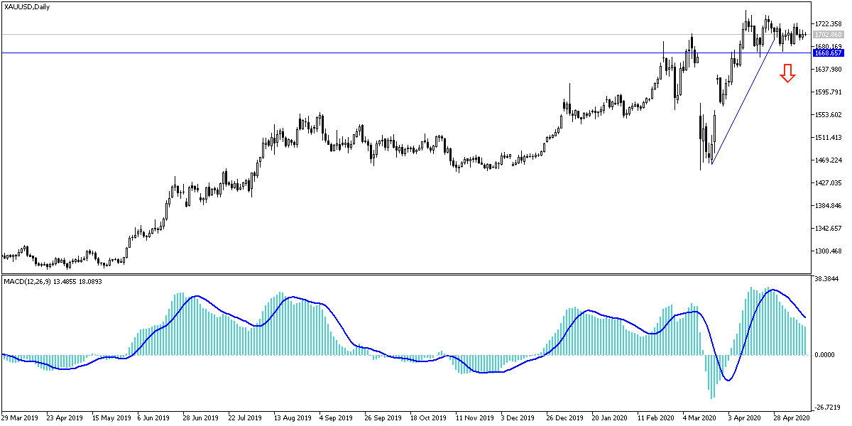 The gold price is still benefiting a lot from the historical and record negative results of the global economic releases due to the strict closures policies approved by countries to contain the rapid spread of Coronavirus. This is in addition to the renewed global geopolitical and trade tensions at a time when the global economy is suffering from a free slide. Gold prices rose to the $1710 resistance during yesterday's session and was stable around the $1703 level in the beginning of Wednesday’s trading. The yellow metal recently gained momentum from the weakening of the USD, as investors are betting on a slow economic recovery, despite ongoing efforts to reopen the economies that were closed to contain COVID-19.
