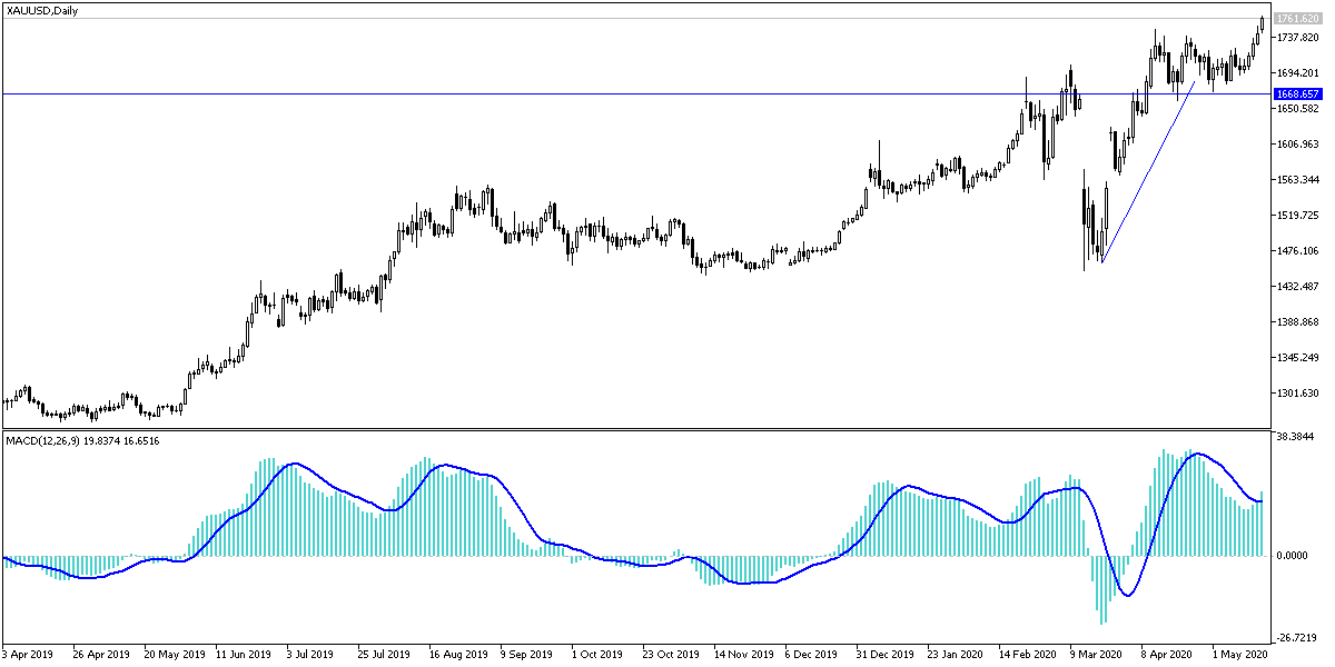 Increasing global geopolitical and commercial tensions contributed to more interest by investors to buy more gold bars, which pushed the price of gold to the $1752 level, the highest for eight years. The factors driving the metal gain included the widening scope of the dispute between the United States of America and China, which reached Trump's desire to suspend all relations with China, as well as the tension between the two sides of the Brexit, the European Union and Britain, over the future of trade and political relations between them in the post-Brexit era. The global human and economic losses from the rapid spread of the Coronavirus continue to overshadow optimism that the global economy will be re-opened amid coexistence with the epidemic until a vaccine is reached. Gold closed trading last week around the $1741 level. With the beginning of trading this week, its record gains continued, reaching the $1764 resistance.