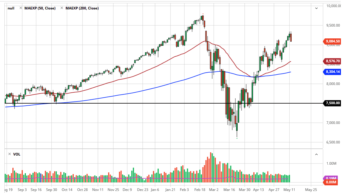To the upside, there is the obvious that continues to cause issues which is found that the 9500 level roughly, and therefore I think we are going to start to see whether or not this rally really can take hold for the long term. At this point, we have seen a significant bounce, but you should also keep in mind that the market is clearly overdone and therefore I think that if a couple of the main stocks that everybody follows runs into trouble, it could cause major problems here. In the short term, I suspect a pullback is waiting for traders, and now it only comes down to the daily candle closing in a supporting manner. If we were to break above that little gap that sits just below the 9500 level, then we will clearly break out to a fresh, new high, completely divorcing from economic reality which has been the way the market has been behaving since the Great Financial Crisis. In other words, it is a very real possibility.