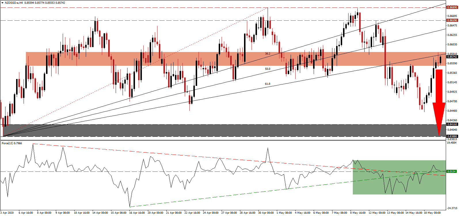 The Force Index, a next-generation technical indicator, recorded a lower high before retreating from its current peak. It is now challenging its ascending support level from where a breakdown will additionally take it below its horizontal support level due to the proximity of both, as marked by the green rectangle. A collapse in the Force Index below its descending resistance level will take this technical indicator into negative territory, ceding control of the NZD/SGD to bears.