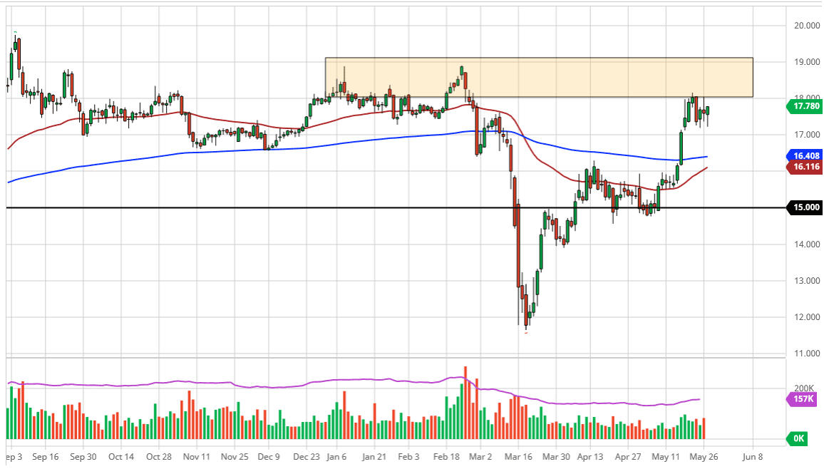 Looking at the upside, the $18 level is obvious resistance, and I believe that the gap from before just above there is a potential resistance barrier as well, and I think that will continue to cause a bit of trouble. However, if we can break above the $18.20 level, then I think it opens up a move towards the $19 level. Looking at this chart, it is highly likely that we are trying to squeeze higher but ultimately this is a market that will lag gold because quite frankly it is not as great of a hedge against inflation. Keep in mind that silver has a built-in industrial component, and as a result the lack of demand for silver is going to be a major issue. In other words, just the precious metal trade is probably going to lift this thing, but it does help. After we have seen such a huge rise to the upside, it makes quite a bit of sense that we continue to consolidate in the short term as the market comes to grips with the big move.
