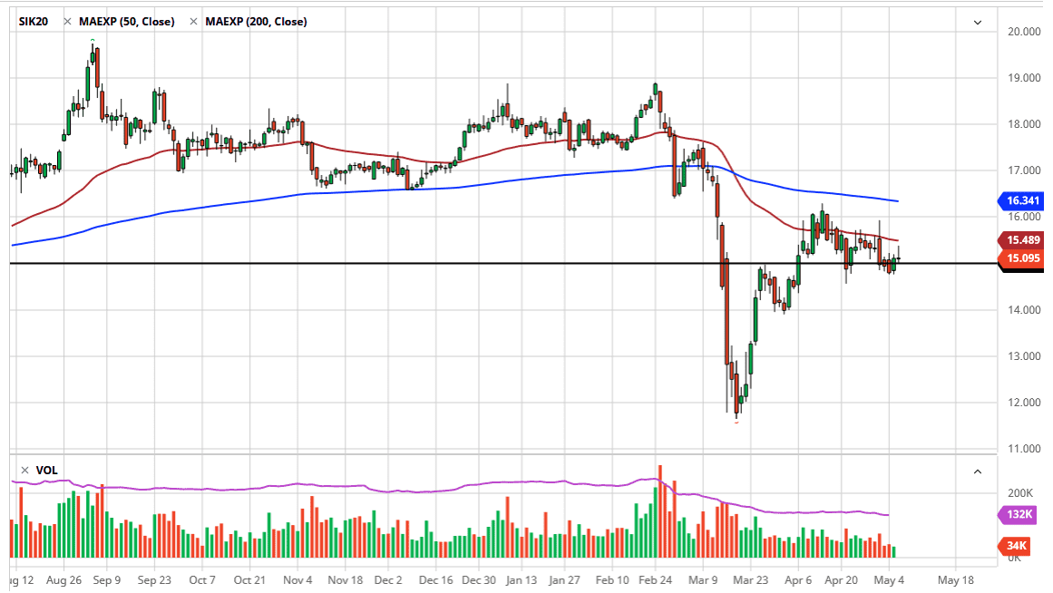 Furthermore, in times of economic contraction, there is more of a safety trade than anything else. Safety tends to favor gold in general, and as a result silver is going to lag in that scenario. However, that does not mean that there will be some precious metal buying when it continues to silver, just that it will not be as a major of a driver as it will be in gold. Having said that, if we do get a good jobs number, or perhaps something that is more akin to “less bad” on Friday, then the market will more than likely take off and try to break above the 50 day EMA, perhaps even reaching towards the $16 level. Above there, the 200 day EMA sits at the $16.34 level, which could be the next target. All things being equal though, it looks as if the market is going to go back and forth right around the $15 level, and at this point time I do not see that changing anytime soon, although it certainly looks as if we have a significant amount of negativity just above the continues to grind away at silver in general. Longer-term, I like holding onto silver but beyond that I do not have much in the way of an opinion on what is essentially a relatively sideways market.