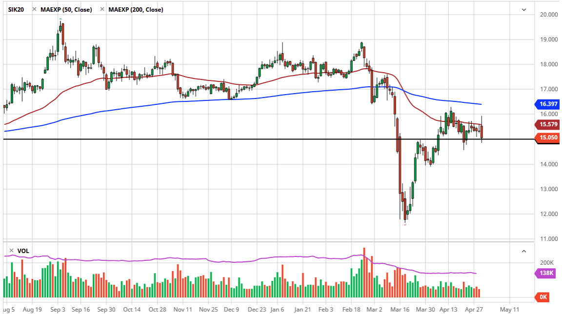 The biggest problem you are going to have with silver is the fact that there is not going to be much in the way of industrial demand, and that is probably not going to change anytime in the near future. If we were to see some type of increased demand from manufacturers, then we could start to make an extremely bullish case for silver as you also have the precious metals aspect attached to it. That being said, silver does tend to have a mind of its own and it is exceedingly difficult to trade at times. This is a market that will of course continue to pay attention to what is going on with the US dollar as well, but also the overall attitude of markets. With central banks around the world flooding the markets with liquidity, one can make an argument for precious metals to rally but if you are trading for that reason alone it is going to be gold that is going to outperform. In fact, I have been doing a lot of “bread trading”, meaning that I would have been going long gold and shorting silver. Longer-term, I have been more than willing to buy silver on dips, but I do it in physical form, avoiding the dangers of leverage.