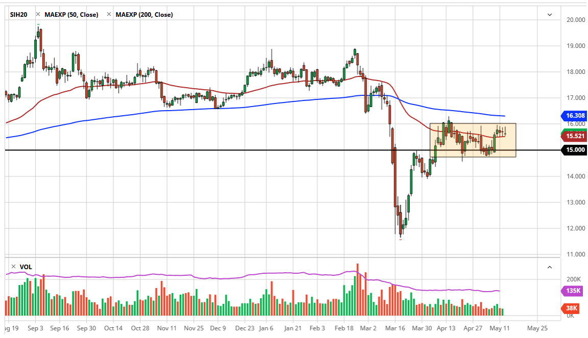 The 50 day EMA underneath continues to offer support, so a breakdown below that level will clearly open up the door lower. Having said that though, if the market was to break above the $16.00 level, and then of course the 200 day EMA above will offer resistance. Ultimately, a break above there would be an extraordinarily strong sign but I do not anticipate seeing that anytime soon. Ultimately, this is a market that continues to be very noisy, so keeping a small position size on is probably about as good as it gets. If you have the ability to trade silver in CFD markets, then you can cut your position size accordingly and therefore ride out the volatility. Otherwise, you are going to need to see that the 50 day EMA broken to the downside in order to take a short-term selling opportunity or break out to the upside. Either way, this is a market that is going to be exceedingly difficult to handle at times, as it has not only the precious metals aspect, but the industrial metals aspect is perhaps even more important. Ultimately, this market continues to underperform the gold market in general, as we have seen gold do quite well over the last several days.