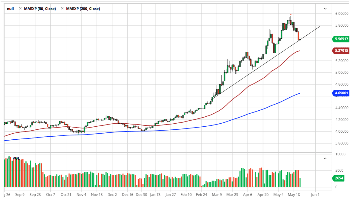 The Brazilian Real has fallen over the last couple of days to reach down towards a significant trend line. The market looks highly likely to continue seeing a lot of questions of this area, as we are right at the 5.56 level, but you should also take a look at the 50 day EMA underneath at the 5.37 level. Even if we break down through this uptrend line, it is likely that it does not change the overall trend. Quite frankly, there are far too many things working against Brazil right now to think that the greenback is suddenly going to implode against it.