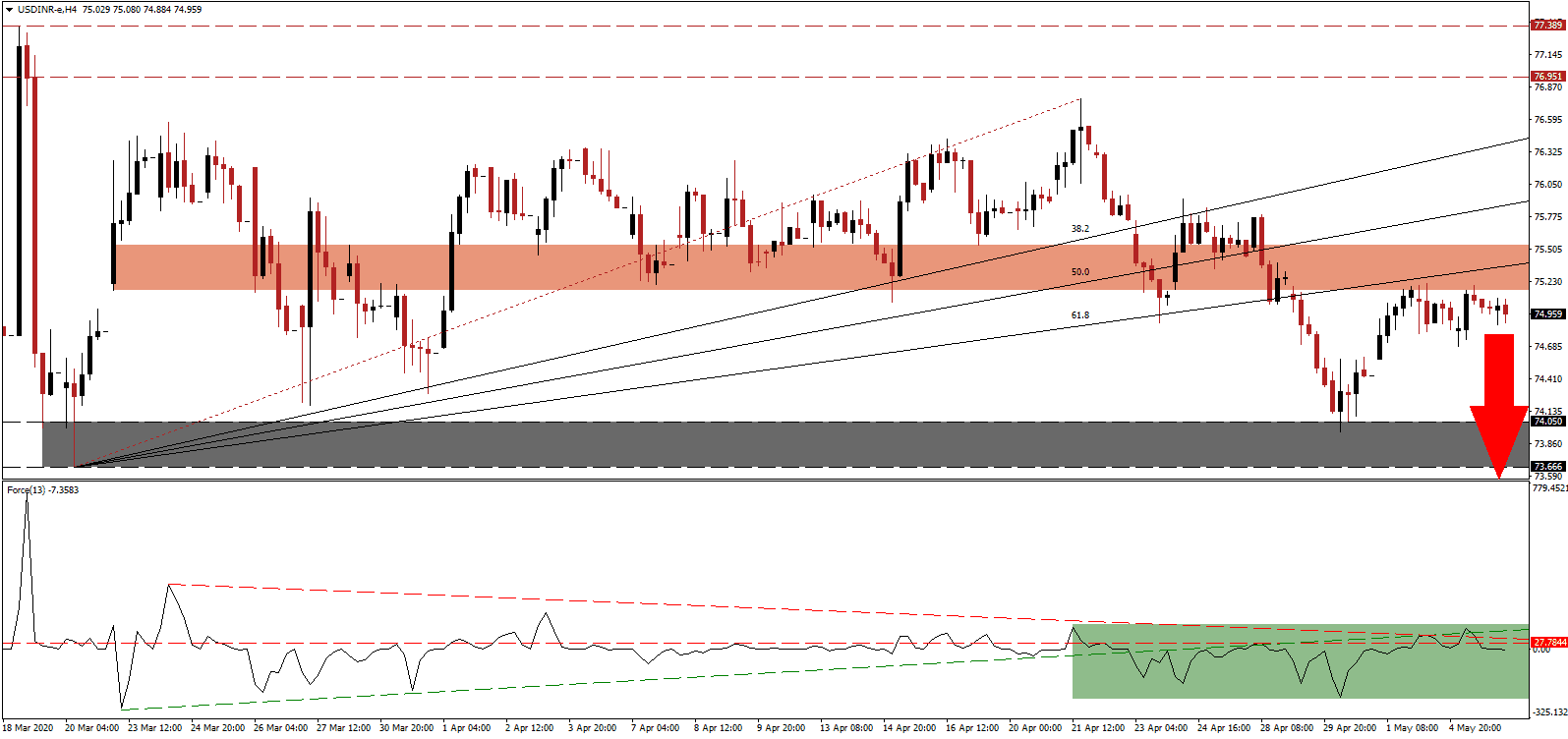 Despite this morning dismal Indian services PMI report for April, showing the sector in deep depressive conditions, the Indian Rupee remained resilient. All economic contributors are faced with a similarly negative circumstance except for agriculture, which is estimated to grow by 3.0%. India used to be an agricultural nation until the 1991 balance of payments crisis. It ushered in an era known as LPG, acronymous for liberalization, privatization, and globalization. The transition placed the service sector at the core of the economy, which now suffers the most from implemented lockdown measures. The USD/INR maintains its position below the short-term resistance zone, with accumulation in bearish momentum likely to result in more selling.