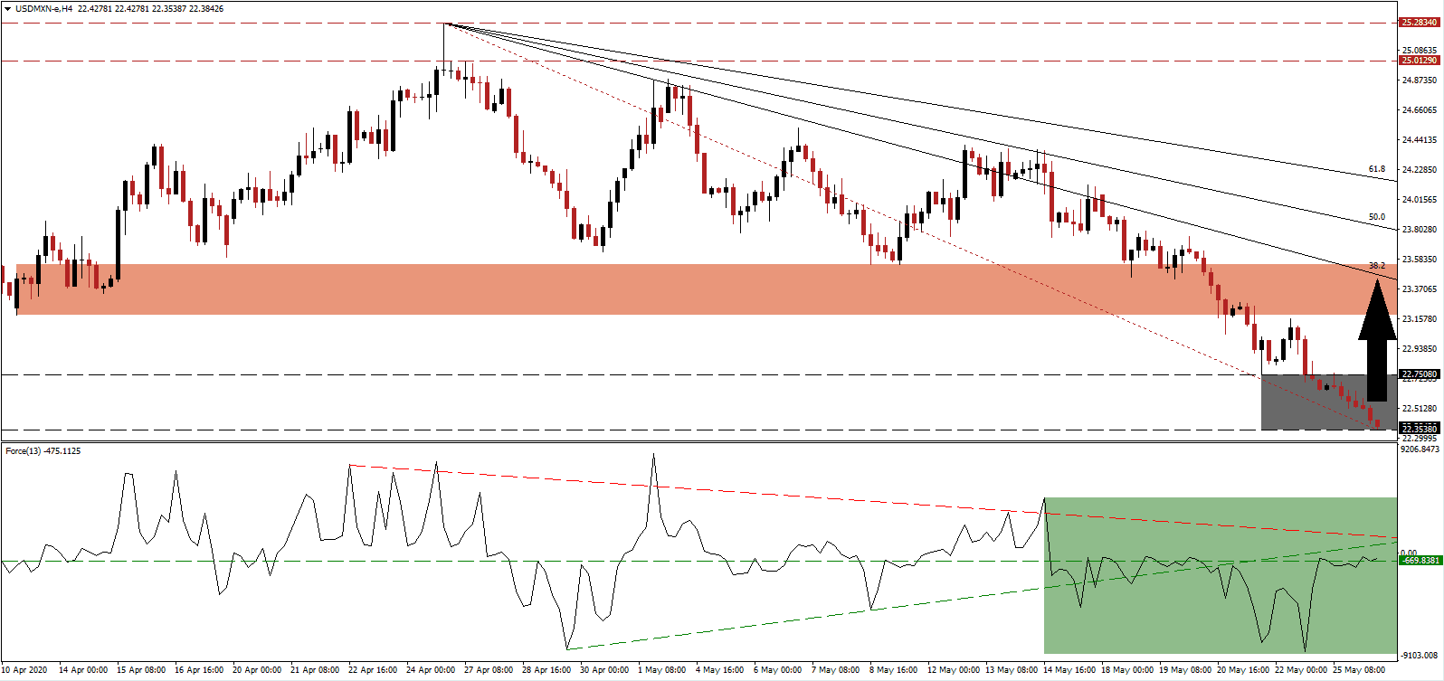 Mexico’s President Lopez Obrador believes the economic slowdown in China will benefit his country, entice a spike in foreign investment, and attract companies to create jobs. The Covid-19 pandemic has harmed Latin America’s second-largest economy, but the deterioration in the fragile Sino-US relationship, anticipated to worsen drastically if the US imposes sanctions on China in response to a proposed security law for Hong Kong, sets to benefit Mexico. While the long-term outlook for the USD/MXN remains increasingly bullish, a brief counter-trend rally is favored to materialize inside its support zone.