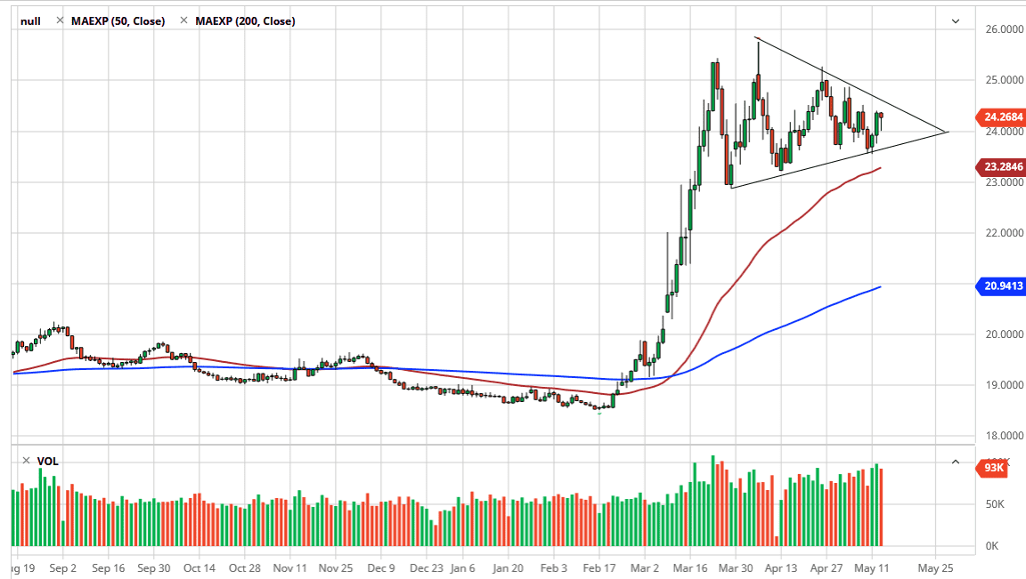 The US dollar has pulled back a bit against the Mexican peso during the trading session on Wednesday, only to turn around and show strength that the 24 level. That is an area that will attract a certain amount of attention due to the fact that it is a large, round, psychologically significant figure. Furthermore, the market is in a bit of a triangle, after shooting straight up in the air. This has been a massive move until the last couple of months, and now it looks as if the US dollar is going to offer a bit of digestion when it comes to the gains.