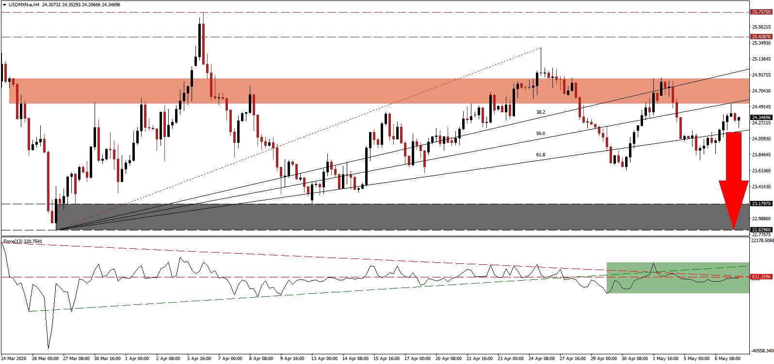One essential level to monitor is the intra-day low of 23.7766, the base of the most recent move below the 61.8 Fibonacci Retracement Fan Support Level. A breakdown will initiate the next wave of sell orders and add volume for an accelerated correction. The USD/MXN is likely to test its support zone located between 22.8296 and 23.1797, as identified by the grey rectangle. Markets slowly shift their attention to the cost of bailouts and lockdowns, where Mexico remains in a superior position over the US.