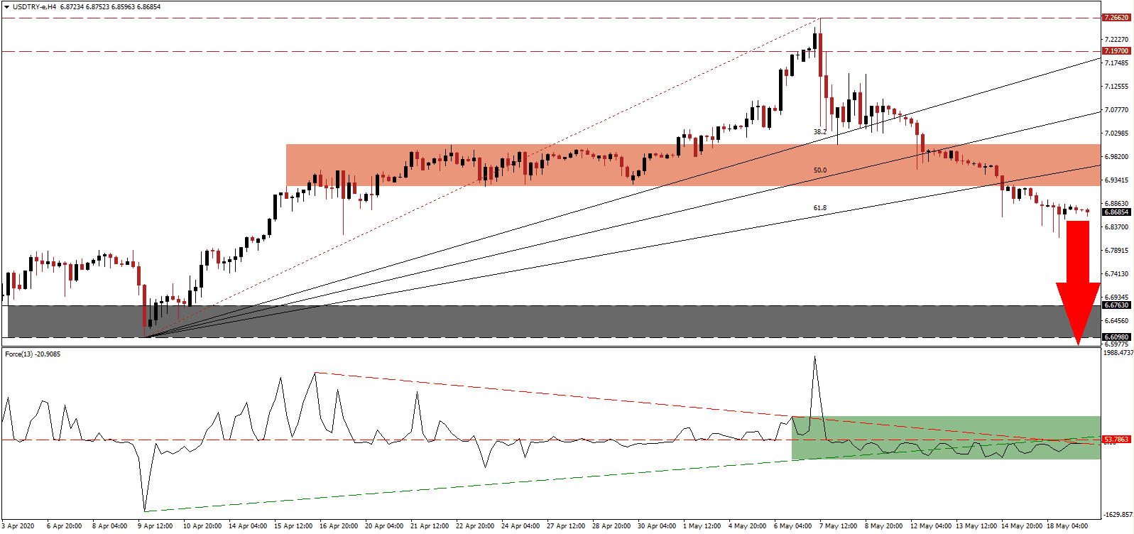 The Force Index, a next-generation technical indicator, confirms the dominance of bearish momentum, suggesting that the preceding advance in price action was purely speculative on thin trading volume. The Force Index remains below its horizontal resistance level, as marked by the green rectangle, and the descending resistance level is exercising downside pressure. Adding to bearish developments was the breakdown below its ascending support level. Bears are in control of the USD/TRY with this technical indicator in negative territory.