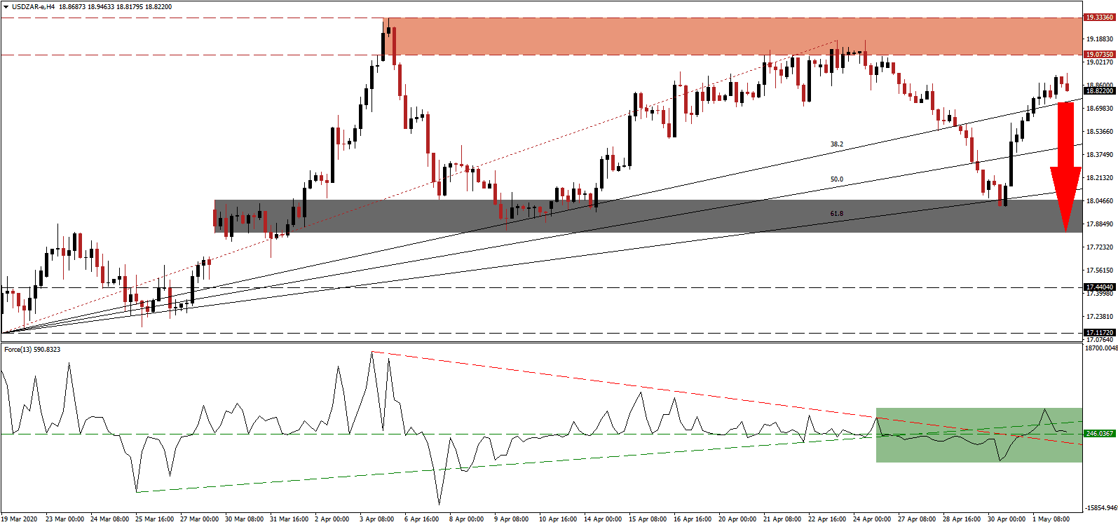 A breakout in the Force Index above its ascending support level could inspire the USD/ZAR to attempt more upside. While South Africa’s short-term economic outlook is challenging, the government started to announce long-term positive adjustments and a willingness to take the Covid-19 pandemic as an opportunity to position itself for a sustainable expansion. This mindset is absent in the US, adding a bearish fundamental catalyst to price action. The next resistance zone is located between 19.8564 and 20.0550, presenting Forex traders a second short-selling opportunity.