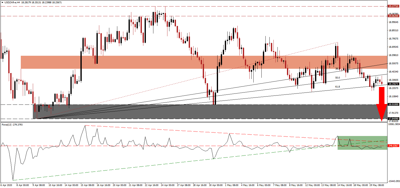 Yesterday’s February mining production data surprised to the upside while declining as compared to January, while annualized gold production surged. Since the nationwide lockdown did not take effect until March, a severe plunge is anticipated. The USD/ZAR established a bearish chart pattern with a series of lower highs, with US government above $25 trillion and household debt exceeding $14 trillion, adding a long-term bearish catalyst. After the breakdown in price action below the short-term resistance zone located between 18.4367 and 18.5894, as identified by the red rectangle, downside momentum increased.