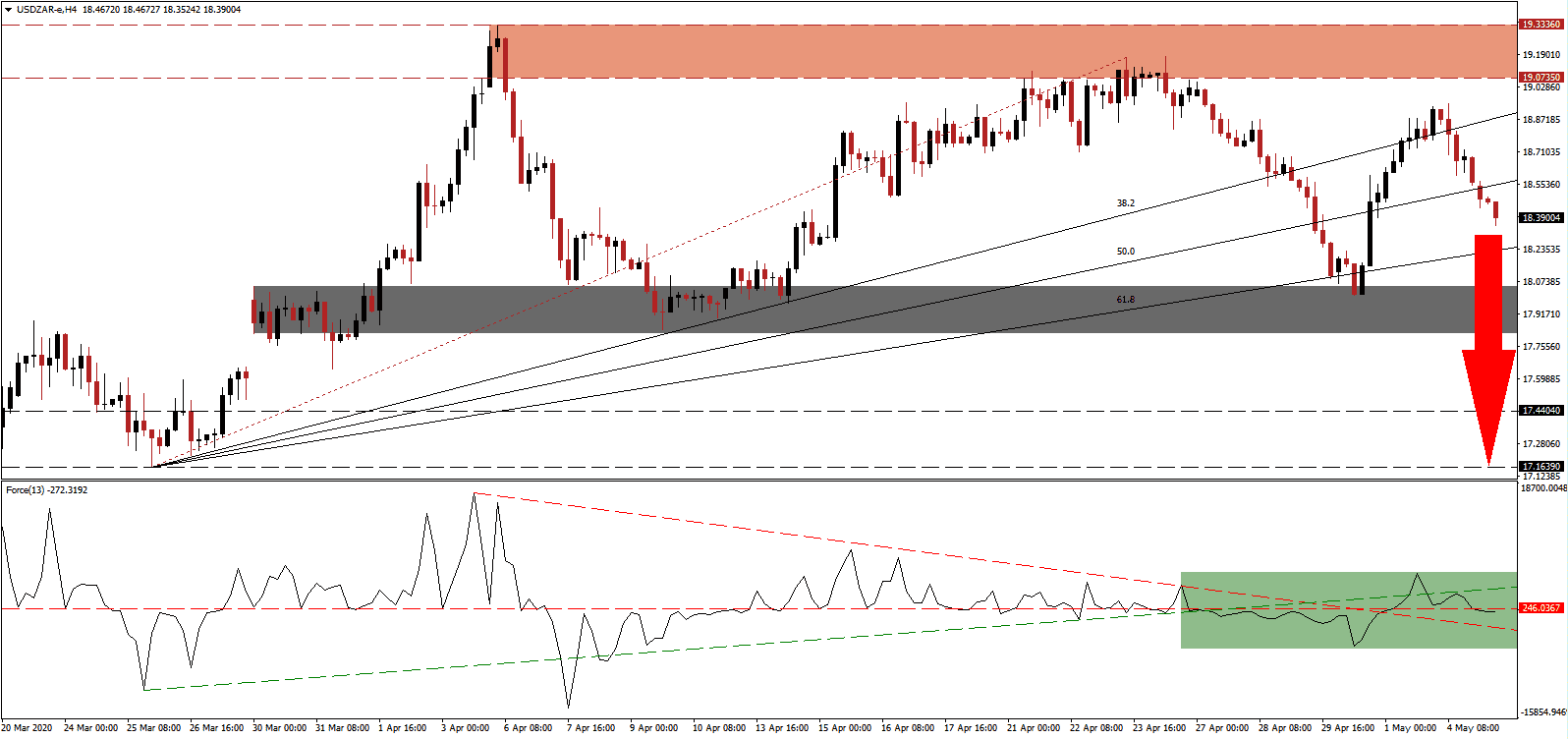 South Africa announced an R500 billion stimulus, but more is projected as Africa’s second-largest economy is forecast to enter a long and slow recovery that may exceed 24 months. The global Covid-19 pandemic is forcing the government to address permanent adjustments to the tax and labor code, generating a long-term bullish catalyst for the USD/ZAR. After the lower high in price action, below the resistance zone located between 19.0735 and 19.3336, as identified by the red rectangle, more downside is anticipated.