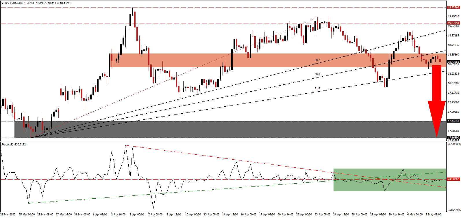 A breakout in the Force Index above its ascending support level could lead to a limited price spike in the USD/ZAR. South Africa is in a unique position to avoid mistakes made by developing countries, creating conditions for a sustained recovery. It will take longer, but the forced adjustments will ensure a healthy economy moving forward. In the absence of a fundamental change resulting in a material adjustment to the outlook, the upside potential remains confined to the narrowing zone between its 38.2 Fibonacci Retracement Fan Resistance Level and the bottom range of its resistance zone.