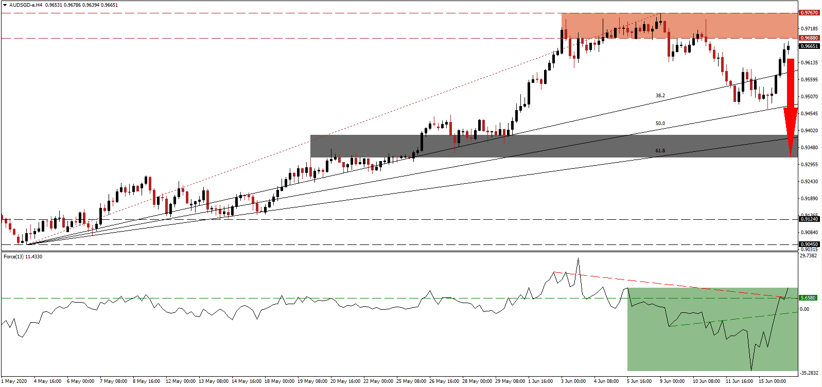 In the event the Force extends its advance, aided by its ascending support level, the AUD/SGD could attempt a breakout. Given the headwinds for the Australian economy, in combination with positive progress out of Singapore, Forex traders are recommended to take advantage of any price spike with new net short positions. The upside potential is confined to its next resistance zone between 0.9876 and 0.9927.