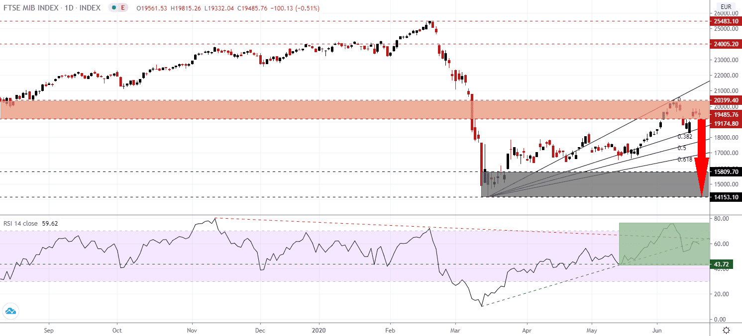 While Italian Prime Minister Conte was able to strengthen his leadership at the peak of the Covid-19 pandemic in Italy, faced with one of the highest mortality rates from the virus globally, the economic crisis is posing a new threat for him to address. Under his direction, Italy imposed a nationwide lockdown, which was seen as a global experiment and repeated across the world, while the budget deficit is on track to reach 10.4% of GDP in 2020. The FTSE MIB is well-positioned for a second breakdown below its short-term resistance zone located between 19,174.8 and 20,399.40, as marked by the red rectangle.