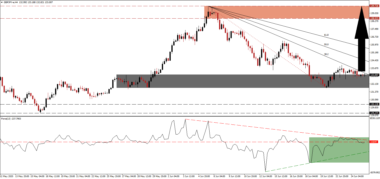 The Force Index, a next-generation technical indicator, was pressured below its horizontal support level, by its descending resistance level, as marked by the green rectangle, converting it into resistance. A positive divergence preceded the initial breakout in this currency pair, suggesting a potential end to the correction. The ascending support level is favored to push this technical indicator above the 0 center-line, granting bulls complete control of the GBP/JPY.