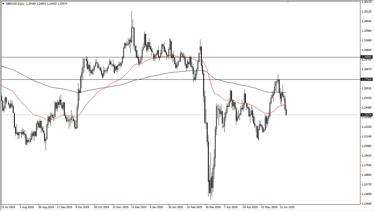 The British pound has fallen down to the 1.2350 level during the trading session on Friday, as the Bank of England has shown itself to be extraordinarily loose with monetary policy and likely to get even worse. Furthermore, the market has broken below the 50 day EMA and even retested it before breaking down. There are plenty of sellers between the 50 day EMA and the 200 day EMA, so it is only a matter of time before sellers jump in. Furthermore, the British pound is likely to be sold off against the US dollar-based upon a “risk-off” type of situation.