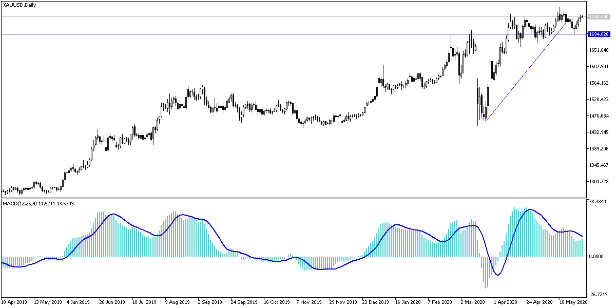 Despite strong gains in global stock markets, amid increasing optimism among investors about the reopening of the global economy, the price of gold continued to move upward, and gains reached the $1745 resistance in the beginning of this week's trading, near its highest level in more than seven years before stabilizing around $1740 an ounce at the time of writing. Global stock gains were offset by concerns that supported the appetite towards gold as a safe haven, against the backdrop of U.S protests at A national level after the death of a black man in Minneapolis during police custody, the latest developments related to US-China tensions over Hong Kong, and some data indicating an improvement in the global economy.