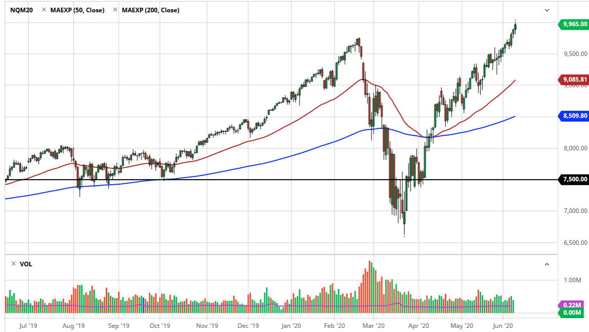 The NASDAQ 100 has initially pulled back a bit during the trading session on Tuesday only to shoot above the 10,000 level at one point during the day. Ultimately, the 10,000 level as an area that caused a little bit of position covering but obviously it is just a round number, and not necessarily something that is going to keep the market from ever going higher. We are overbought, I think that it is obvious but that should only offer an opportunity for those who are missing out on the rally to get involved at cheaper prices. In fact, I suspect that is what people are simply waiting on.