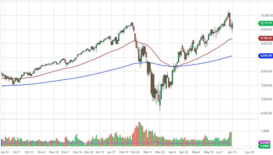 Now that the Federal Reserve has stepped in and started talking about buying these bonds, this continues to find traders looking for some type of risk appetite to step into. The 10,000 level of course is significant, as it was the scene of a major breakdown so therefore, I think it continues to be a bit of a short-term ceiling. All things being equal, the market is likely going to struggle to break down significantly, because there is so much in the way of choppiness underneath. That normally means that there is a lot of order flow, and that of course normally slows down movement in one direction or another. The 200 day EMA would be the next target after the 50 day EMA, which of course also opens up the possibility of 9000 offering support. If we can break to a fresh, new high, then it is likely that the market simply grinds to the upside. I do not necessarily like shorting this market, and I think that short-term pullbacks are looking for buyers to come in and pick up value.