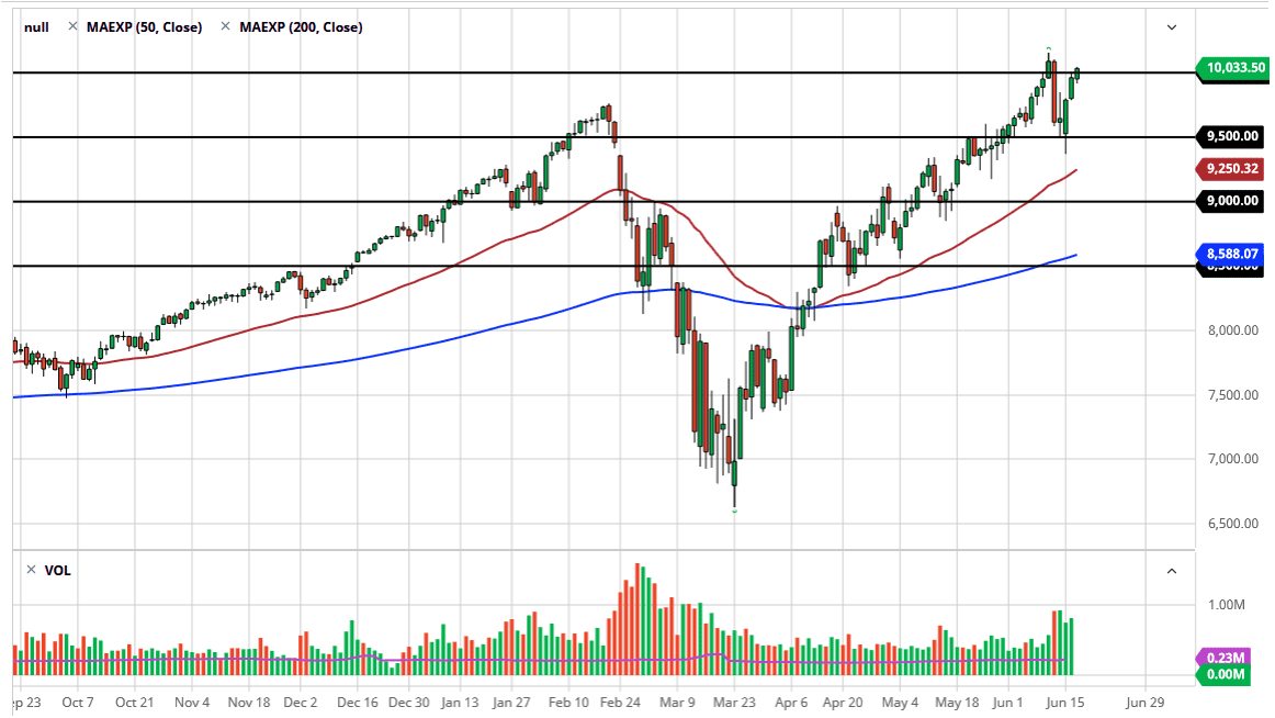 The NASDAQ 100 has rallied again during the trading session on Wednesday, breaking above the 10,000 level during the day. Ultimately, it looks as if we are ready to break out to a fresh, new high, and send the NASDAQ 100 much higher. This makes sense, because it is driven by just a handful of stocks that everybody knows and loves, including Facebook, Google, Apple, Tesla, and Amazon. That is the entire market over the last several months, so course the NASDAQ 100 is going to outperform almost everything else.