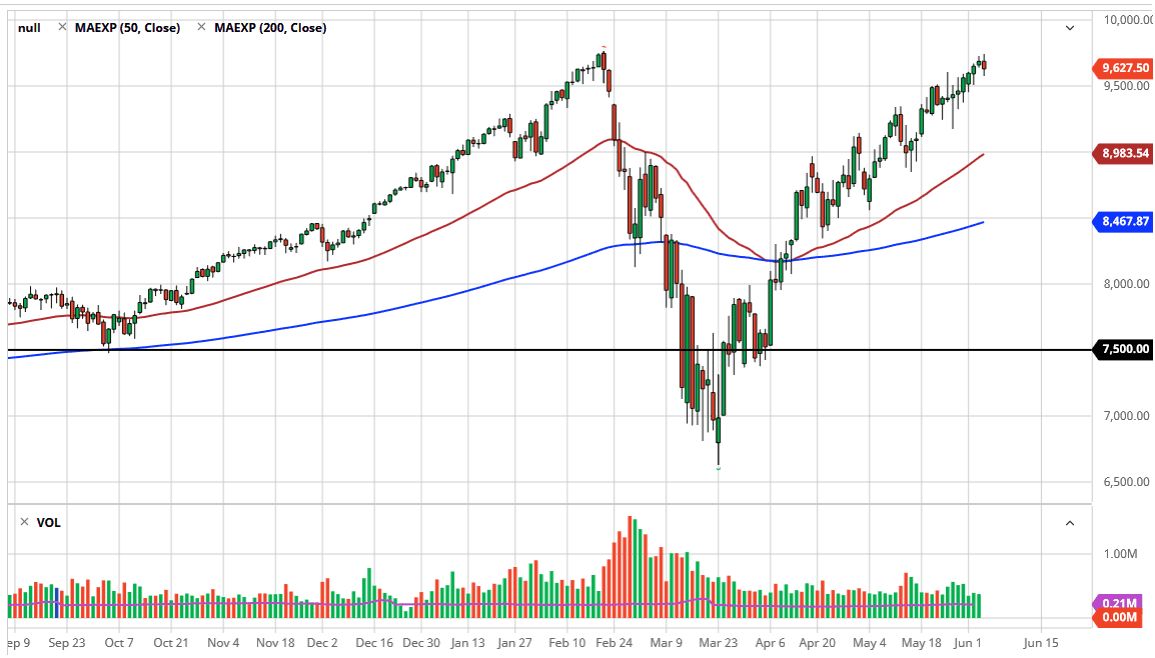 To the downside, I think the 9500 level offers a lot of support, and then after that it is likely that we will go to the 9250 level. Below there, then we have the 9000 level which will be supported by the 50 day EMA. All things being equal, until the market starts to focus on the economic reality of the world, this is a market that will not be able to fall for a significant amount of time. The liquidity that the Federal Reserve is pushing out there is forcing markets higher, as they have done several times before. This does not mean we will not fall Monday, quite frankly we will probably break down rather significantly with some type of regularity. This is how the market has behaved over the last 20 years or so, and I think it is going to become the norm now.
