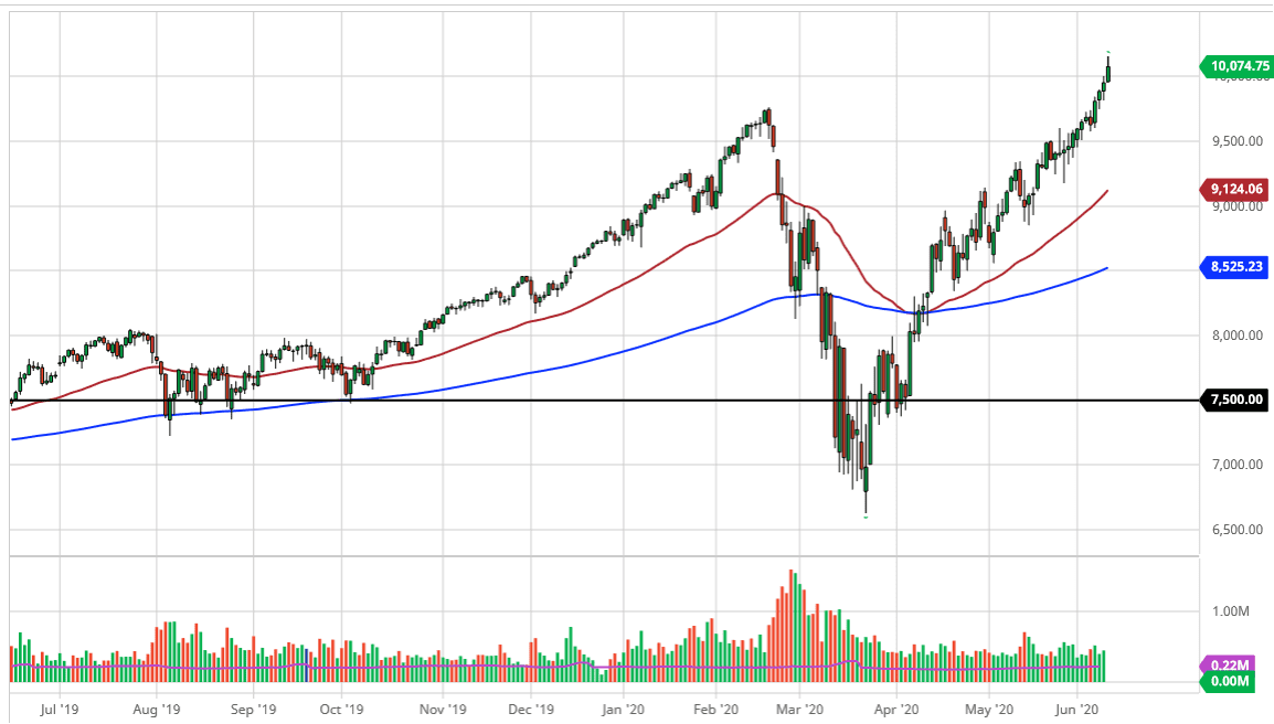 The NASDAQ 100 has rallied again during the trading session on Wednesday, as we have sliced through the 10,000 level. Ultimately, this was partially in reaction to the Federal Reserve meeting, and of course statement afterwards. It appears that the Federal Reserve is willing to continue stepping on the gas when it comes to the policy, meaning that they are more than willing to support the market. This has money flowing into the “big five” at the top of the food chain when it comes to the NASDAQ 100. If we are going to continue to see this, I believe that the NASDAQ 100 is going to outperform other indices such as the S&P 500.