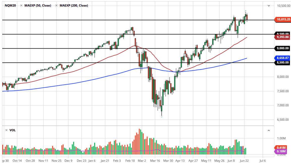 All things being equal, I do not think that the market is going to suddenly fall apart, but I think a pullback might be something that people look forward to, because it gives the buyers an opportunity to pick up a little bit of value. After all, the NASDAQ 100 has led the way for some time, and I do not see that changing anytime soon. If we were to break down below the 50 day EMA, then we could go looking towards 9250 level, and then eventually the 9000 level. I do not expect to see that happen, but it would be a 10% pullback, something that a lot of the larger traders will use as an entry point a pullback in what has been an uptrend by just about any measure you use. Things are getting volatile, so keep your position size small and use micro contracts if you can via futures or use a small CFD position. Ultimately, this is a market that cannot be taken lightly but clearly there is more momentum to the upside than down over the longer term.