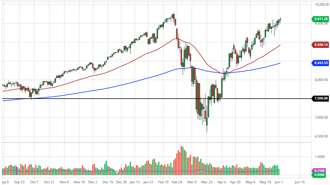 The NASDAQ 100 has had a choppy session on Tuesday, forming a neutral candlestick as we have gone back and forth. Ultimately, the market has seen the 9500 level as a massive support level, but it is worth noting that we could not take off to the upside. That does not mean that we cannot rally from here, and quite frankly I think the NASDAQ 100 is highly likely to go looking towards the all-time highs which are only about 3% from here.