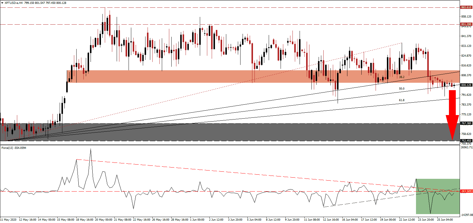 In the event the Force Index reclaims its ascending support level, serving as resistance, platinum may push higher. The uncertain demand and gradually increasing supply are adding more bearish pressures than US Dollar weakness is providing bullish momentum. Therefore, the upside potential in the XPT/USD remains limited to its intra-day high of 835.590, the end-point of its redrawn Fibonacci Retracement Fan sequence.