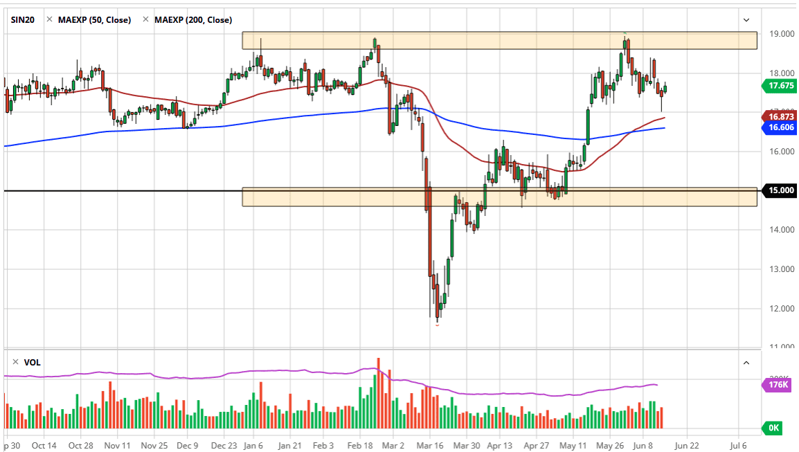 The 50 day EMA sits just below the $17 level, so that should continue to offer plenty of buyers, and could push this market back towards the $19 level. The $19 level has had significant resistance more than once and has seen a lot of pressure on multiple attempts to break out above it. With this in mind, I recognize that the market probably has a lot to do in order to continue going higher and therefore I think dips in the market will continue to be attractive as buying opportunities. I believe that the $17 level is the most obvious short-term support level, and it should be paid close attention to, due to the fact that it has been important more than once. As long as we can stay above, there it is more of a “buy on the dips” mentality going forward.