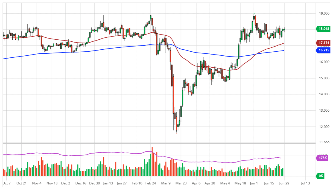 Silver markets went back and forth during the trading session on Monday, as we continue to see a lot of noise in this market. The $18 level is a bit of a fulcrum for price, so it is not a huge surprise to see that it has offered itself as a bit of a magnet for price during the session. All things being equal though, it does look like buyers are stepping into this market every time we pull back. Because of this, I think that the market is likely to see a lot of buyers on dips, extending all the way down to at least the $17 level.