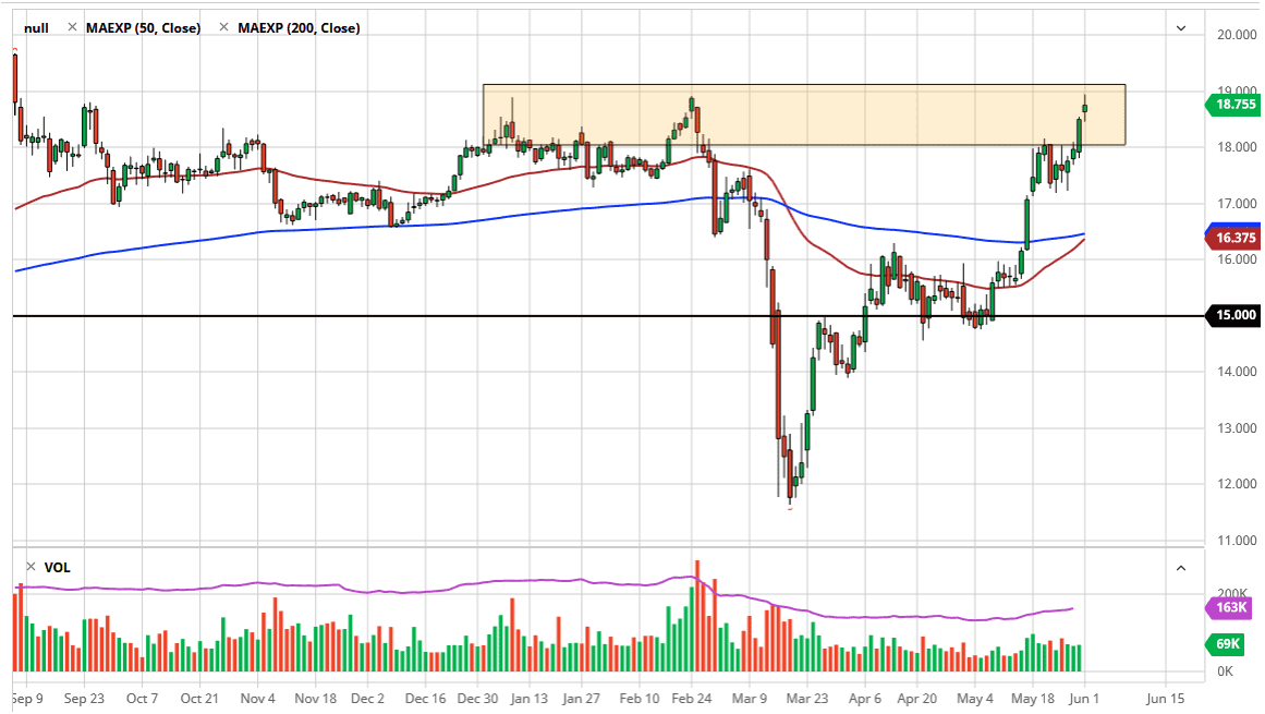 If we do break down below the $18.00 level, then it is likely that the market could go down to the $17.25 level which had previously offer quite a bit of support. We are getting ready to have the “golden cross” form, when the 50 day EMA starts to break above the 200 day EMA, and that of course is something that a lot of longer-term traders get excited about. The reality though is that it is likely the market is going to pull back somewhat significantly from the area we are in, due to the fact that the $19 level has offered so much resistance in the past. Furthermore, the “golden cross” and the “death cross” (the exact opposite) are quite often signals that are extremely late, and for the most part pointless.