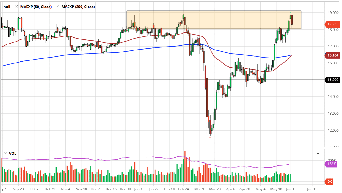 The silver market had a rough trading session on Tuesday, as the $19.00 level continues offer massive resistance. We cannot break above this level with any type of ease and have tested it multiple times over the last several months. The fact that we pullback during the trading session on Tuesday is not a huge surprise, especially considering that silver does not necessarily move like gold, in the sense that it has a lot of industrial uses, and therefore it gives you more of a reaction like base metals will at times.