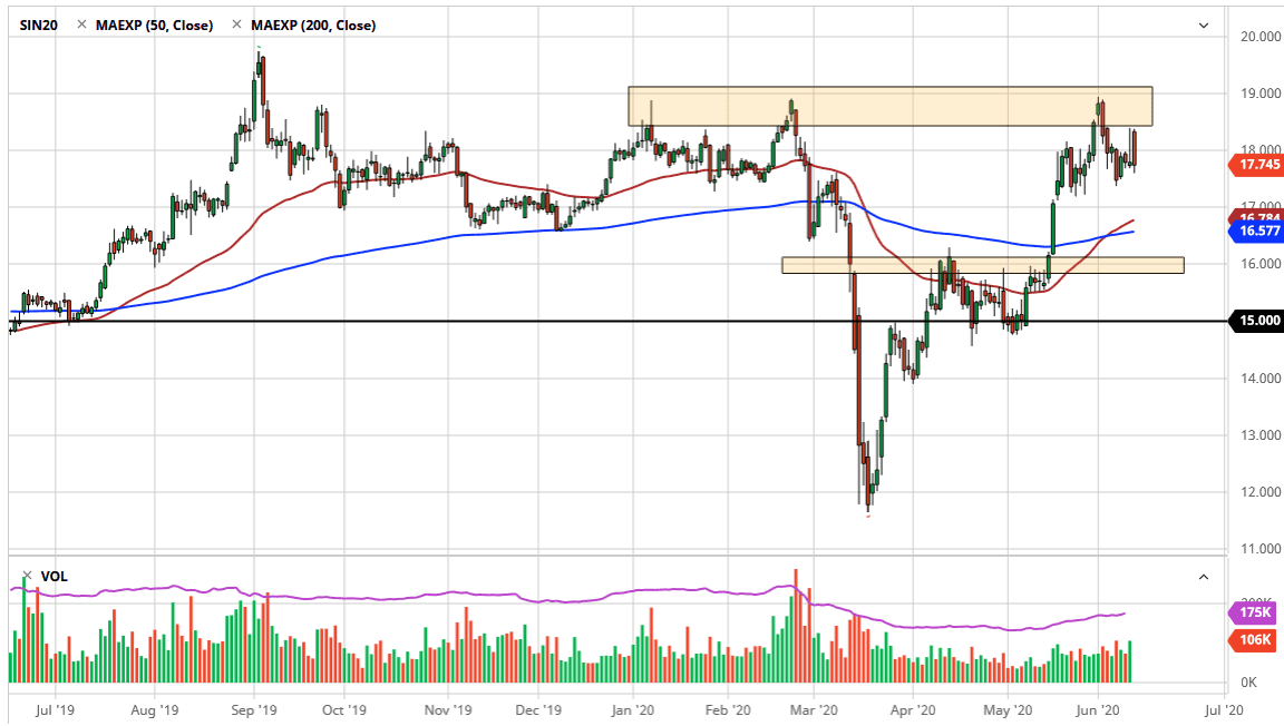 Yes, there is the precious metals aspect of the trade, but if you are looking to trade precious metals, it is going to be gold that you are more than likely going to get the best return from. At this point, the market continues to find plenty of support near the $17.20 level underneath, just as the $18.50 level offers a little bit of resistance, with the $19 level being even more resistant. That being said, I do believe that the market is likely to buyers on dips, because longer-term it still looks extraordinarily strong due to the central banks around the world easing monetary policy. In other words, they are bringing down the value of their perspective currencies, driving up the value of hard assets such as silver.