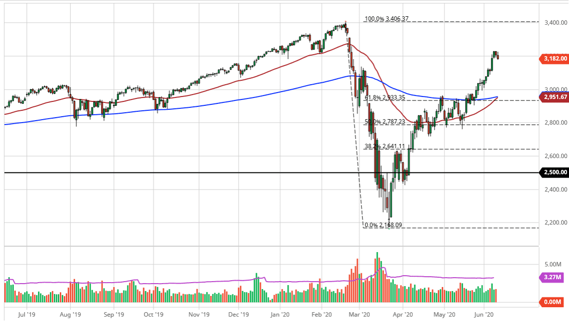 The S&P 500 initially tried to rally during the trading session on Wednesday but gave back the gains as we started to reach towards the highs of the previous couple of sessions. By doing so, the market then found plenty of sellers, breaking down towards the 3185 handle. The reserve decision and statement of course is something that we need to be aware of, and the reaction of course is something that is worth paying attention to. Perhaps the traders on Wall Street did not get enough monetary methadone this time, and therefore traders are looking to perhaps take significant profits as the market has gotten too far ahead of itself.