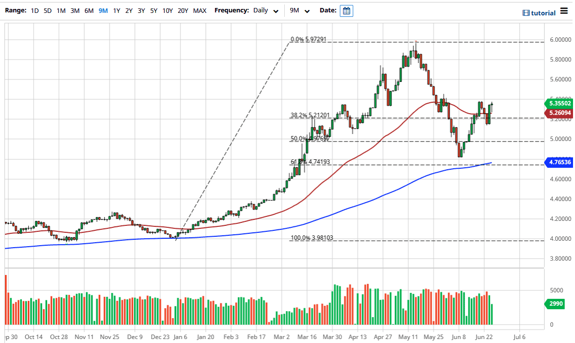 Once we get that breakout, and I do believe that it is likely to happen, the market is more than likely to go towards the 5.6 level next, followed by the 5.8 level, and then eventually the 6.0 level. The market has been forming a bit of a bullish flag as of late, after pulling back towards the 61.8% Fibonacci retracement level. Furthermore, the 200 day EMA is sitting just below there and rising, so that is another reason to think that perhaps buyers would be involved. The 6.0 Real level is a massive ceiling, so I think getting above there is going to take some doing, which would almost certainly be a reaction to a major “risk off” type of situation. The US dollar against the Brazilian Real could very well signify how the world is feeling about emerging market commodity based economies, which could be under serious threat if the global growth situation continues to look incredibly soft and weak.