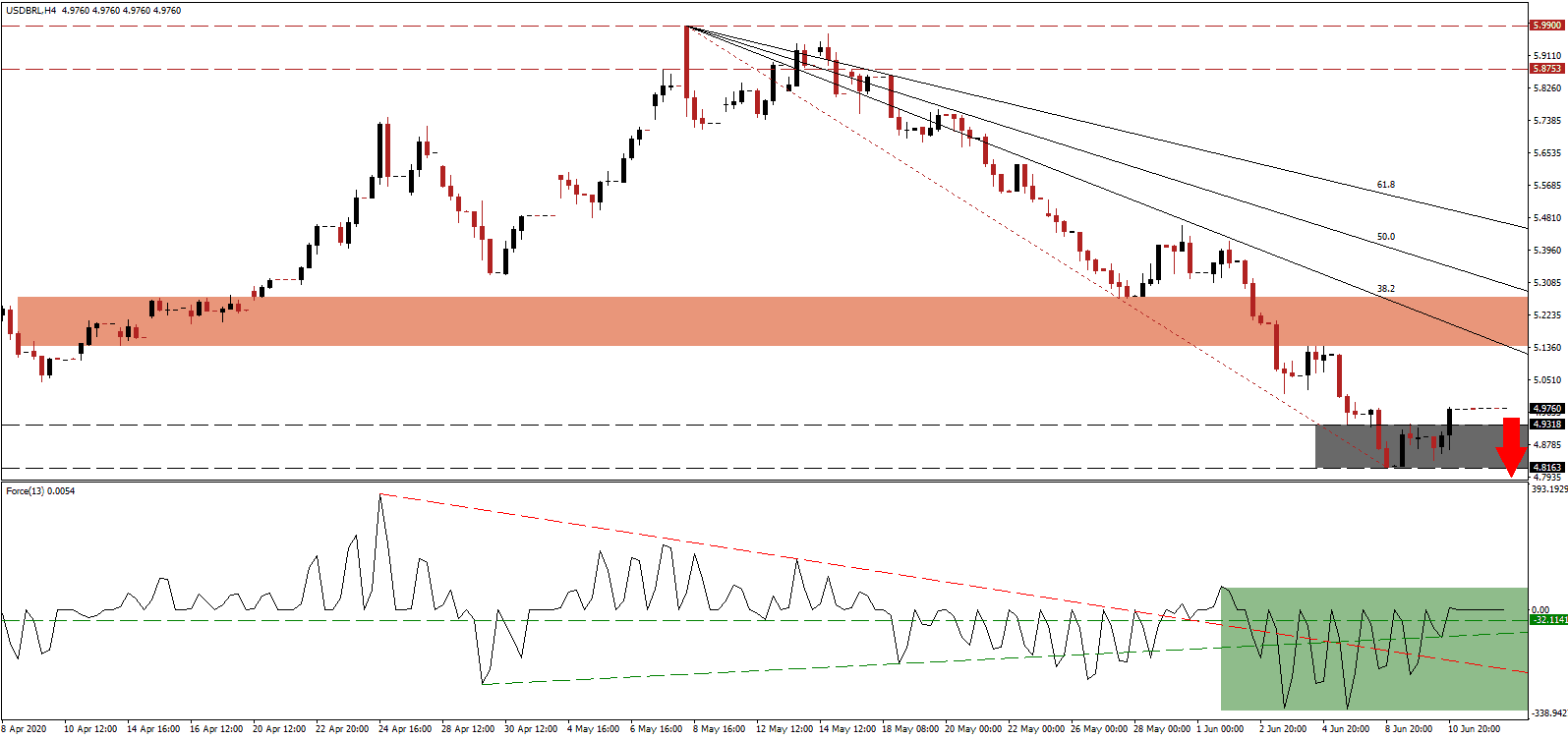 One bright spot emerging from the travel restrictions is Brazil’s current account deficit, which could turn into a surplus in 2020. April saw the most significant excess in history at $3.8 billion. Positive progress in financial conditions of Latin America’s largest economy, and the world’s seventh most populous nations, is adding a distinct long-term bullish driver for the Brazilian Real. The descending 38.2 Fibonacci Retracement Fan Resistance Level is anticipated to force a breakdown in the USD/BRL below its support zone located between 4.8163 and 4.9318, as identified by the grey rectangle. Price action is then clear to extend its correction until it challenges its next support zone between 4.3819 and 4.4525.